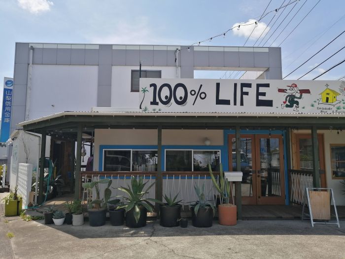 事務所の看板には、社名ではなく「100%LIFE」の文字が…。