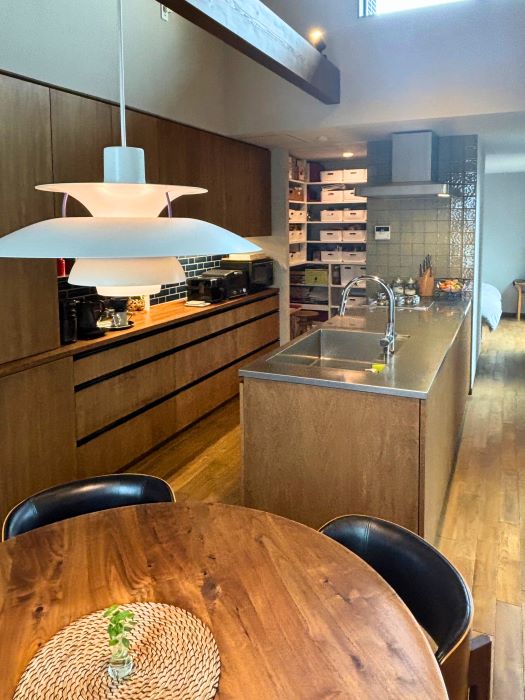 そのインテリアに馴染むキッチンは、ペニンシュラタイプに。背面に大容量の造作収納を設けたオープンキッチンは、調理しやすく孤独に感じることもありません。