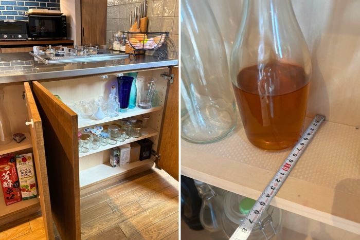 リビング側の収納は、薬やお酒のストックに最適の深さに