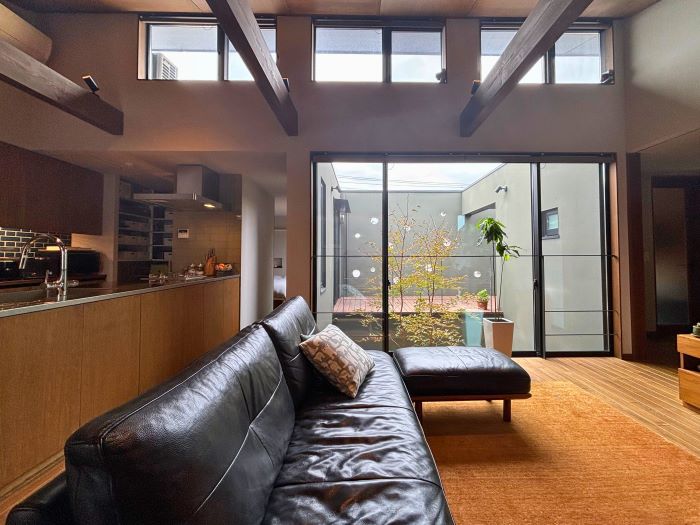カーテン不要!中庭の緑と空を取り込む2階リビングの家