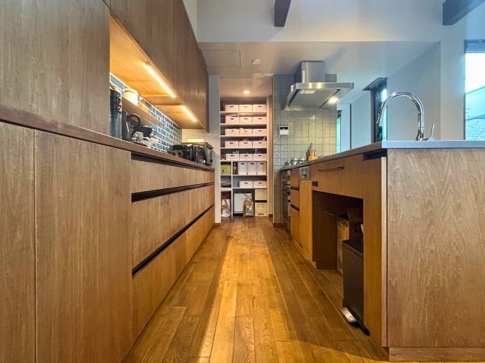 キッチンは奥のパントリー側にコンロ、ダイニング側にシンクを配置