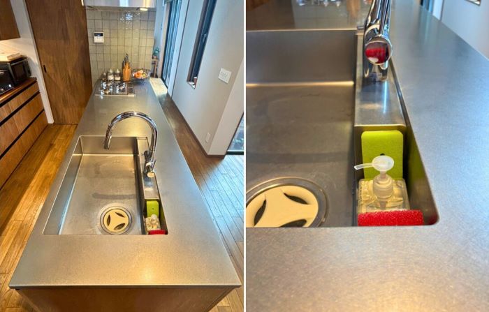 シンクは、使う洗剤やスポンジを出しっぱなしにしないよう、ポケット付きW800mmのシンクに。洗剤のボトルもスポンジもポケットの高さに収まっているので、リビング側からも見えません。