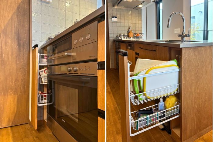 キッチンの両サイドには、使い勝手抜群の収納があります。奥のコンロと壁の間の狭いスペース(写真左)には、調理中でもすぐに調味料が出せる収納を。手前のシンク脇(写真右)には、出しっぱなしになりがちな、まな板の収納場所を作りました。どちらも幅はわずか150mm!