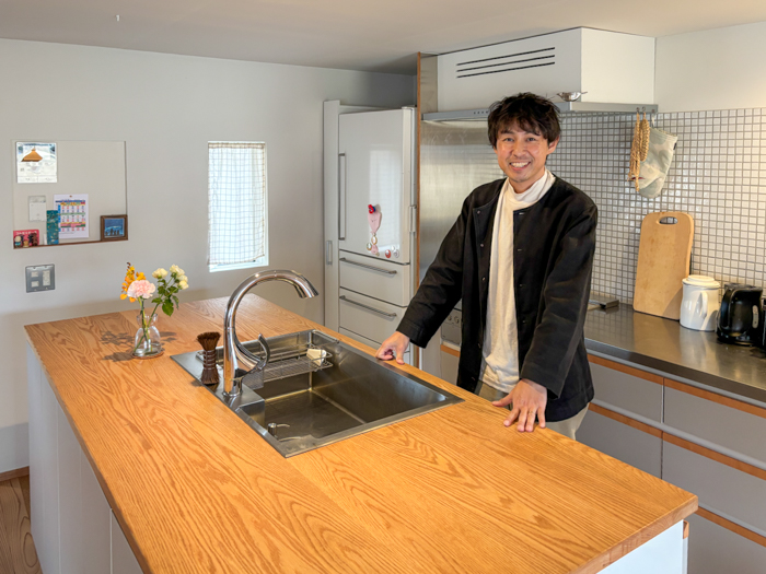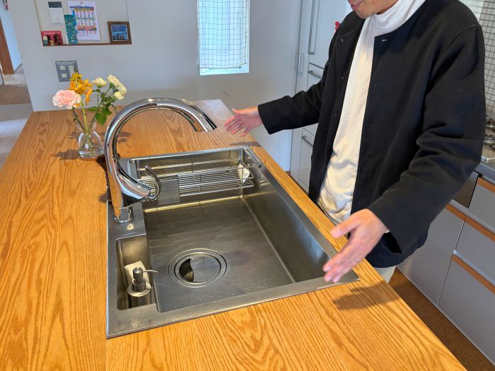 「COMODO建築工房では、ナラの横はぎ材の天板と、この幕板包丁収納、ポケット付きEシンクは、標準仕様としています。相談に来られた方にはモデルハウスとしても使っているので、使い勝手も体感いただけます」