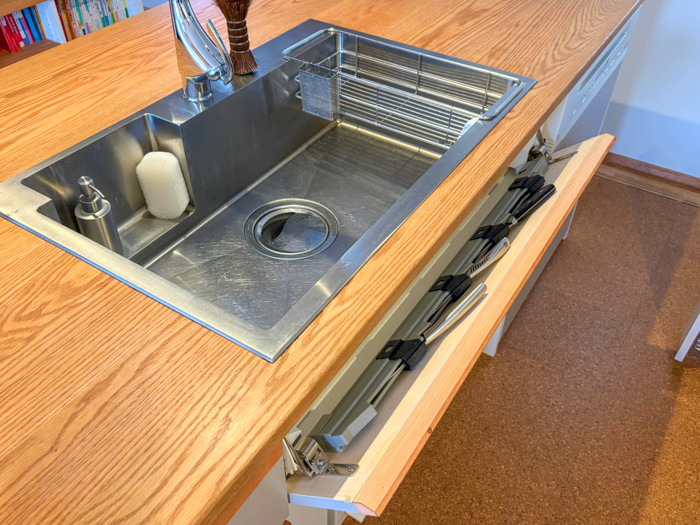 シンクの手前の幕板部分には、「幕板包丁収納W900 4本差し」を取り付け、包丁の定位置に。