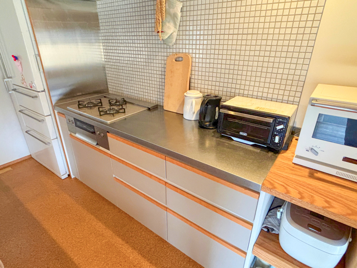 こちらはコンロのある壁側。手前の引き出しには、食器類を収納しています。