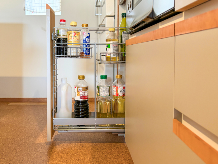 そして、コンロ横には、一升瓶が収納できるW150mm(外寸)のスライドストッカーを設置。調理しているときもすぐに取り出せます。