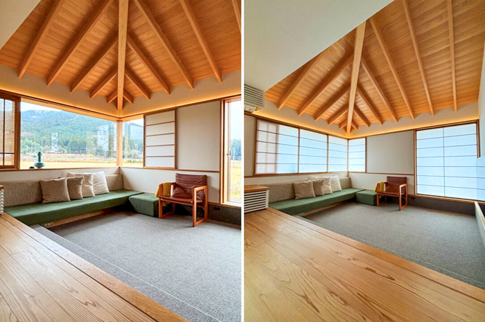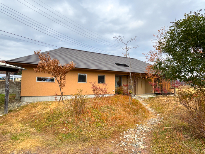 「屋根の勾配は、2寸か3寸あれば十分なんですが、あえて茅葺屋を彷彿させる急勾配屋根(6寸)に。そして外壁は、古民家の土壁をイメージして、火山灰を主原料とした塗り壁(そとん壁)にしました」