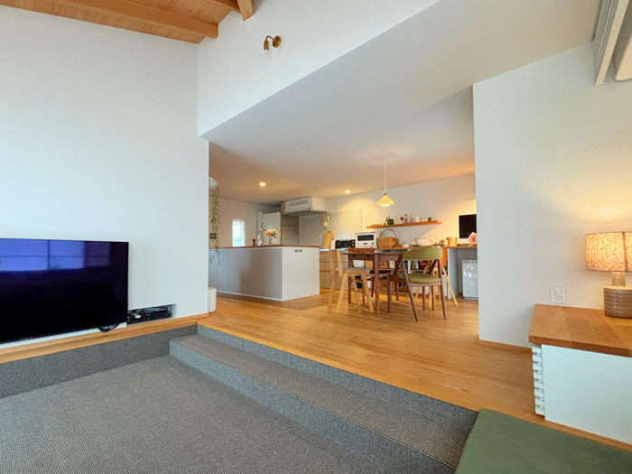 「LDKは建具が少ない分、単調になりやすいので、リビングの床を下げたり天井の素材を変えたりして、視覚的に変化をつけました」