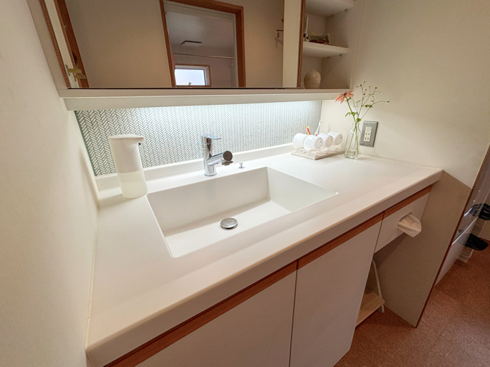 洗面所には、ekrea Partsの人工大理石一体洗面カウンター「フレックスシンク」を採用しています。