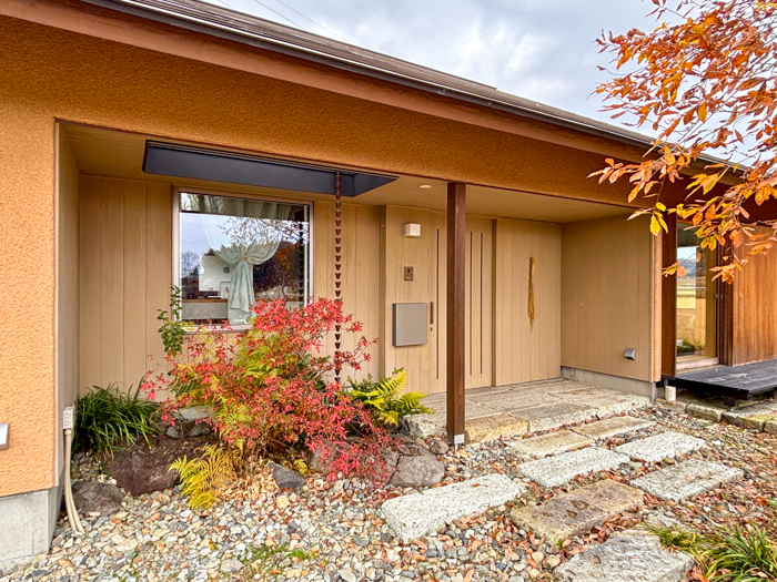 地元名産の大谷石を敷いた先に玄関が。大屋根に包まれたような玄関スペースには、日光杉を張りました。そして、自然塗料の「プラネットカラー」を塗装。