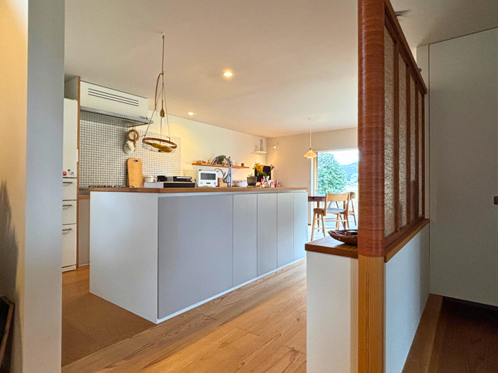 そして振り返るとキッチンが。このキッチンと玄関の間には、麻のロールスクリーンの建具をはめています。目隠しになりつつ、キッチンにいても帰宅した家族の気配が伝わります。