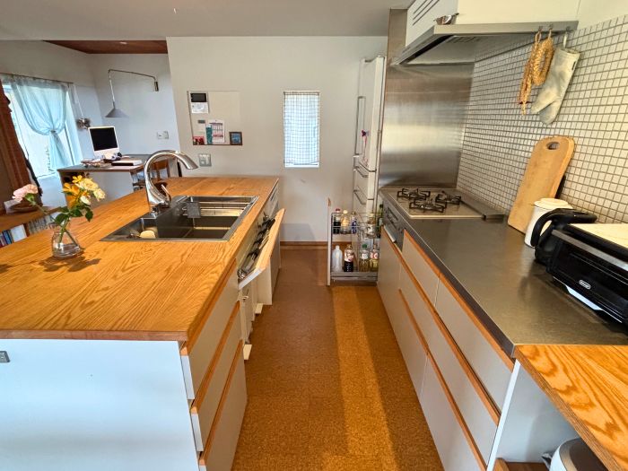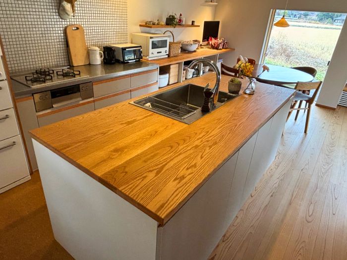 木天板にしたことで、家の雰囲気にも馴染んだキッチン。使い勝手だけでなく、手触りもよい仕上がりになりました。