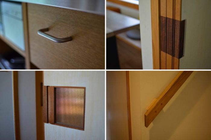 家を見回すと、各所に造作による工夫が。(時計回りに)キッチンの取っ手には、ekrea Partsのシンプルな長取っ手を使用。コスト的にも抑えられるうえに、木の面材に馴染みます。