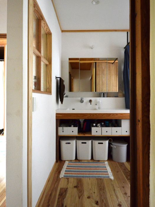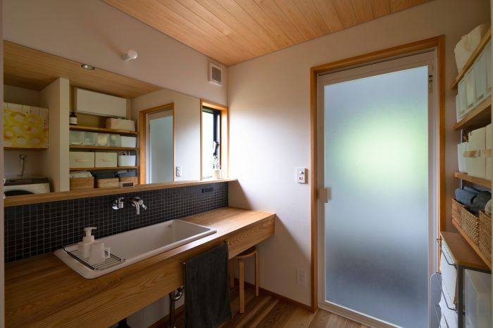 洗面台は、タモの集成材を使って大工工事で造作。木をふんだんに使用することで、どこにいても心地よさを感じる家になりました。