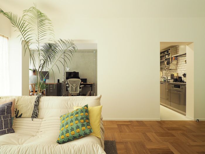年数が深く建物自体が壁式構造のため、制限がありながらもリビングダイニングとワークスペースの間は、可能な限り開口部を広げ、ひとつながりの空間にしました。