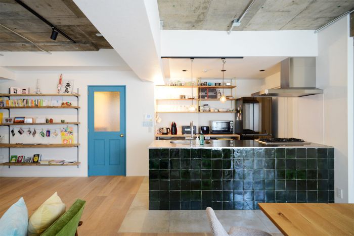 『carrousel』。ダイニング側からキッチンを見る。ブルーのドアの向こうは玄関