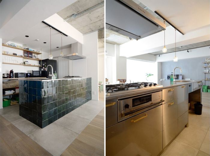 大判のタイル、ステンレスのキッチン、ゴールドの取っ手…お気に入りを詰め込んだキッチンが完成。造作することで実現できたキッチンです。