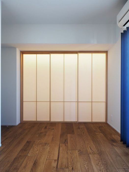 ベッドルームのクローゼットは扉ではなく障子に。クローゼット内部に間接照明を入れたことで、行灯(あんどん)のような雰囲気を楽しめます。