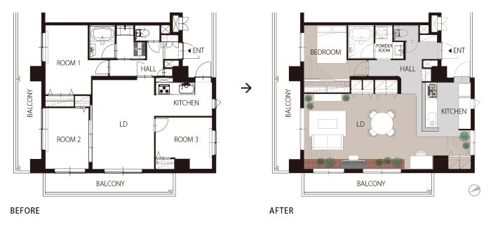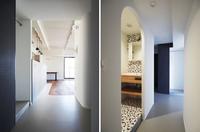 施主の要望に応えて、ごく普通の延床面積60㎡台3LDKの間取りが、プランも仕上げも大変身。ヒアリングで明らかになった要望と丁寧に向き合い、答えが導き出されていました。