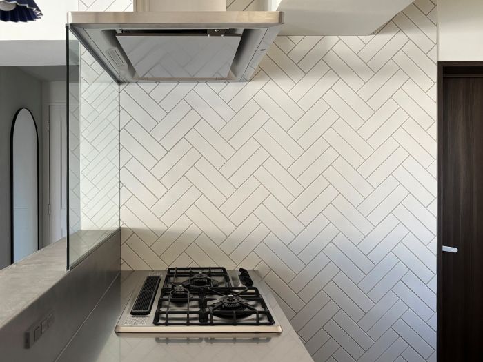 「コンロ横の壁は、上品なアクセントになるよう、二枚掛けのヘリンボーン貼りをご提案しました。帯のようにも見えませんか?」