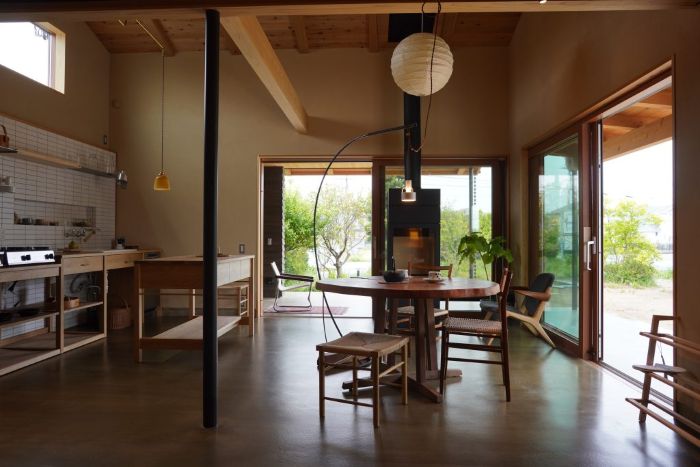 庭に面したLDKは、モルタルの土間に。室内と外部の中間ともいえる場所で、靴でもOKです。調理途中でネギが必要になったら、そのまま庭の畑へ。施主が願っていた暮らしが実現しました。