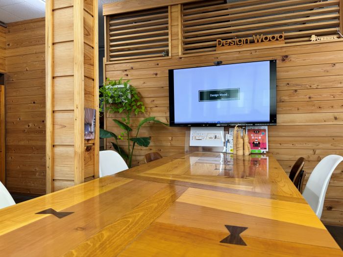 杉板張りの壁に囲まれた打ち合わせコーナー