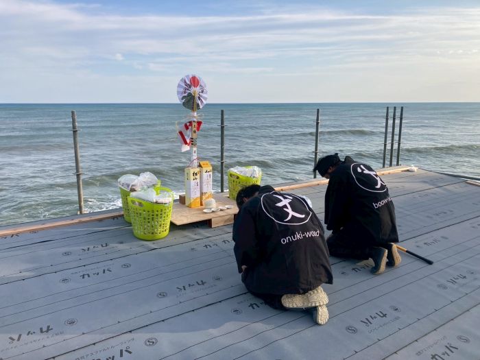 屋根の上に祭壇を設け、工事の無事完了を祈る上棟式の様子