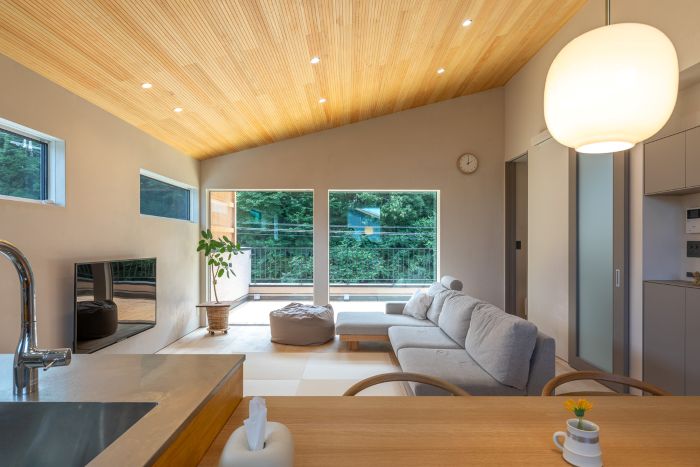 林のある西側に大きな開口を設け、床には明るいカバの無垢材を使用。さらに、天井にヒノキの板を張ったリビングは、木と緑に包まれた心地よい空間になりました。