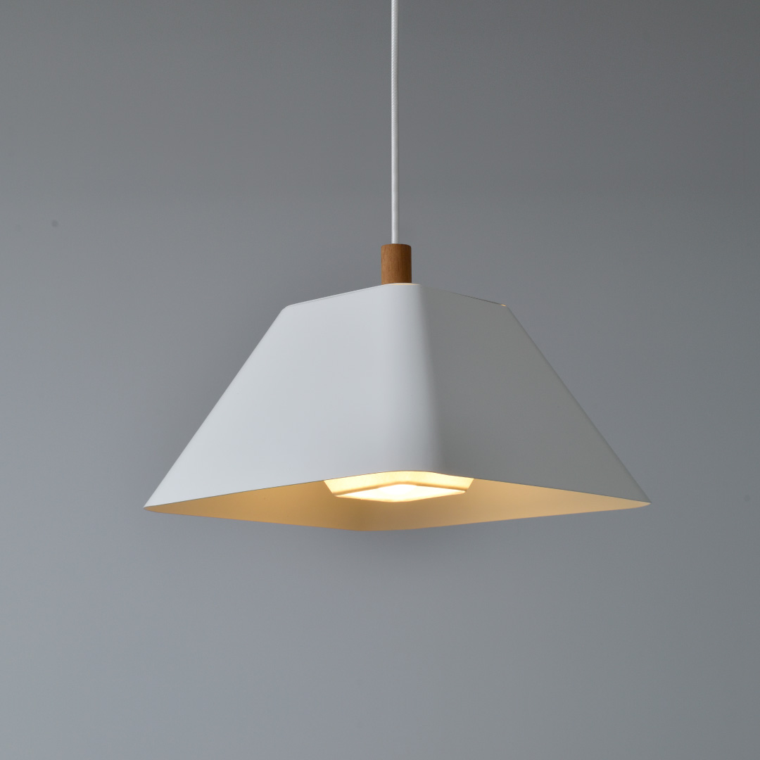 スチールに白の焼き付け塗装をしたペンダントライト。台形の端正なラインをベースに、角を丸く整えた独自のフォルムは、2枚の鉄板にR加工を施し、溶接・研磨して台形に成型という、高度な技術から生まれた。