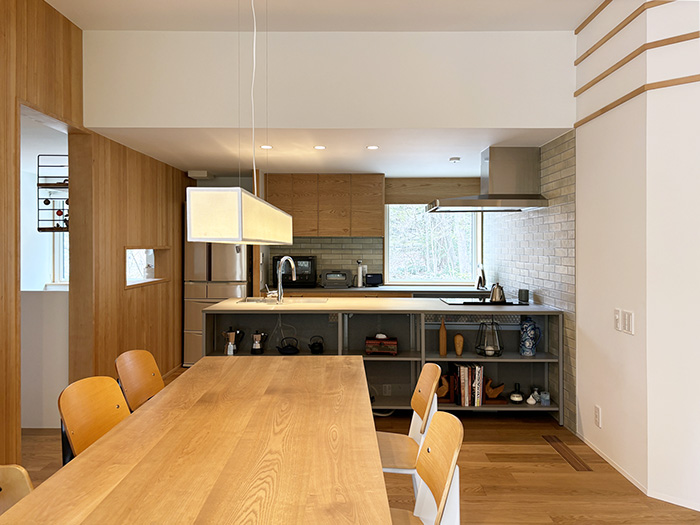 こちらはダイニング側からキッチンをみたところ。視線がキッチンの奥に設けた窓の外の景色へと抜けていきます。