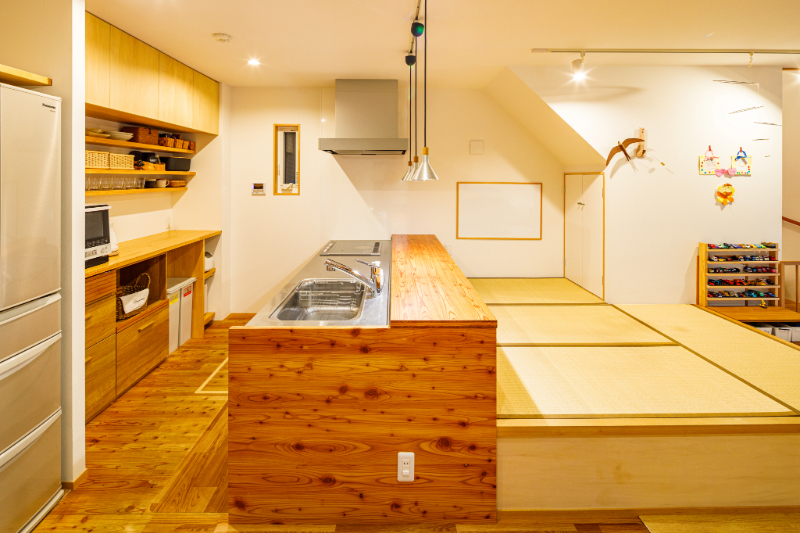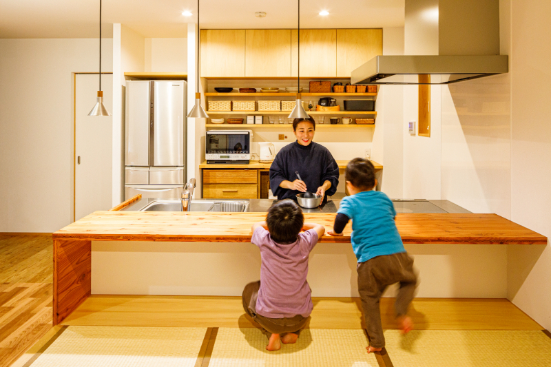 住まい手はこの建物のコンセプトが気に入り購入。その後、増木工務店社長の齋藤さんの家に案内したところ、キッチンの前に小上がりの畳コーナーがあるプランに一目ぼれ。