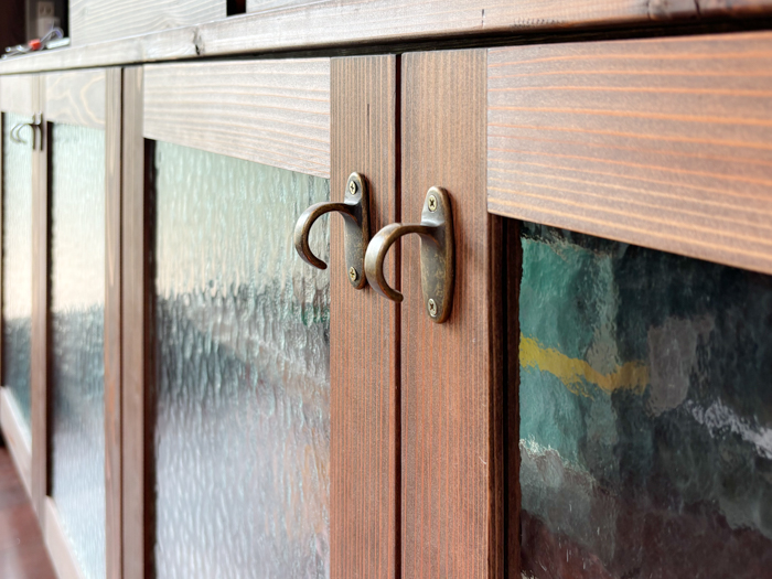 「扉にはステンドガラス用のガラスをはめ込みました。曇りガラスだと中が見えないし、透明なガラスだとうるさくなる。ちょっとモヤモヤした感じのガラスだと、多少中が散らかっていても気にはならないので(笑)」(山上さん)