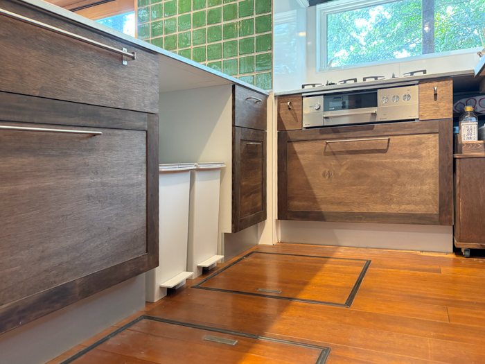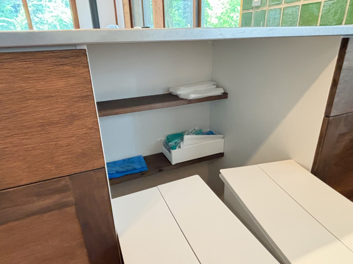 「2つ並べたときに、後ろがないと、どうしても凸凹した感じになってしまいます。それに後ろの部分もったいないので、最初に置くゴミ箱を決めてもらいました。そして、そのサイズに合わせて、奥に小さな棚を2つ作りました」(山上さん)