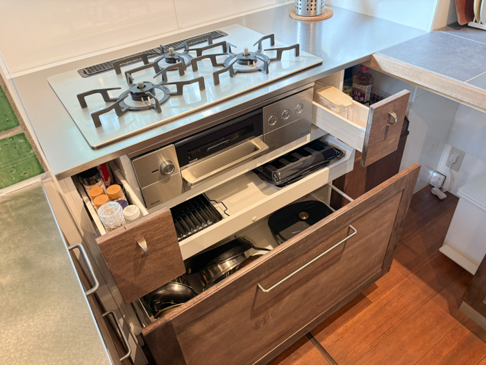 キッチン・キットのコンロ下キャビネット(900mm)には、フライパンや鍋類、調味料がすっきり納まっています。