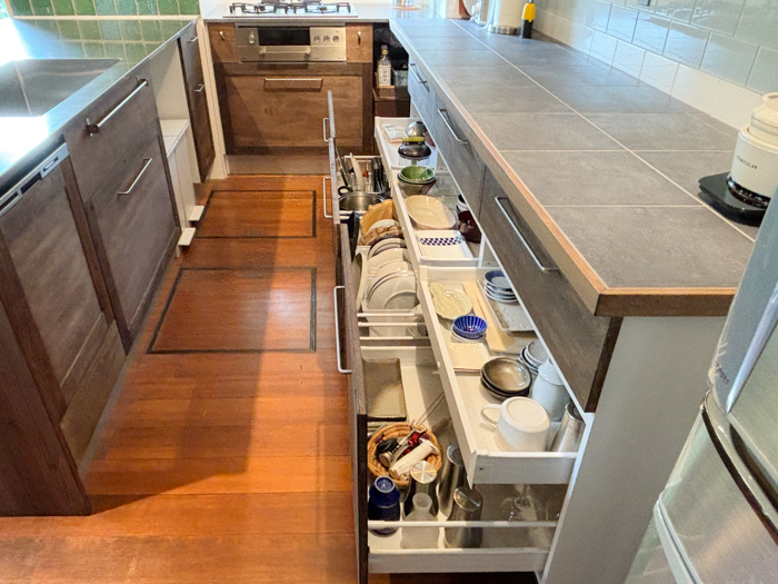 壁側に設置したのは3つの収納ベース。奥行き650mmにしたことで、大量の食器類がきれいに納まっています。