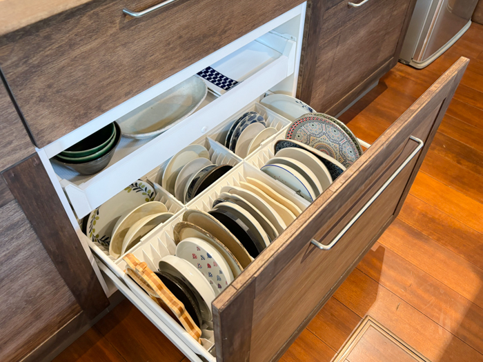 「手持ちの食器類は、すべてここに納まっています。お皿は立てて収納できるようにしたので、出し入れもラクです」(奥さま)