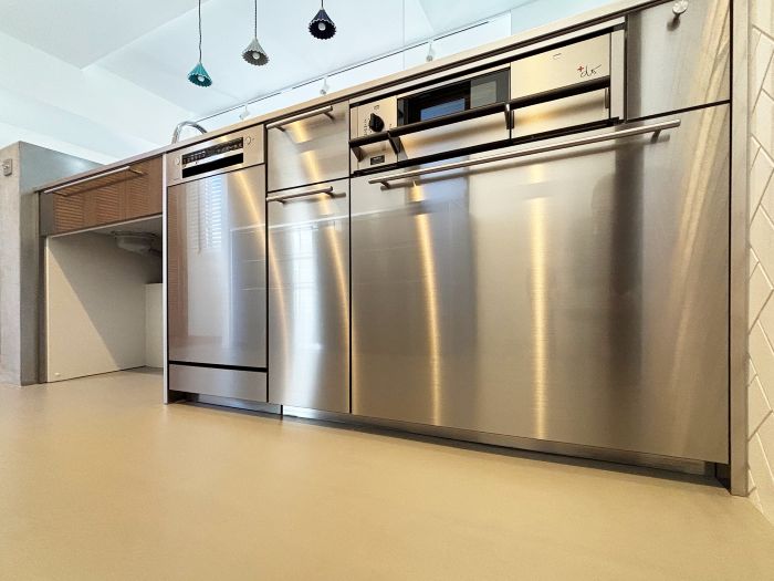 キッチンとカップボードは、空間社オリジナルのステンレス扉の仕様に