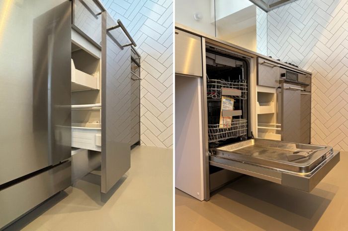 しかし、食洗機はフルオープンタイプ。開閉の都合で扉材の高さに制限が出てしまいます。そうすると、引き出し扉と下部のラインを揃えることができません。