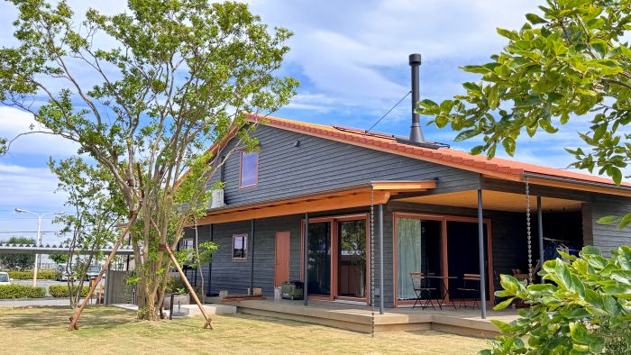 こちらは素焼き瓦を葺いた大屋根と板張りの外壁が、印象的な家です。庭の背の高いサルスベリは、家族の成長を見守り、日差しを適度に遮ってくれます。そしてこの庭には、毎日の食卓に並ぶ野菜を育てる畑や鶏舎もあります。