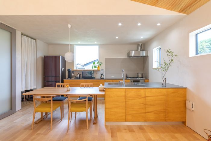 オーヌキが手がける「木の家」に、大工の手仕事で仕上げられたキッチン・キットがしっとりと馴染んでいます。それは、単なる設備としてのキッチンではなく、住まい手の暮らしと、作り手のこだわりが共鳴し合う、この家だけの特別な風景となっていました。