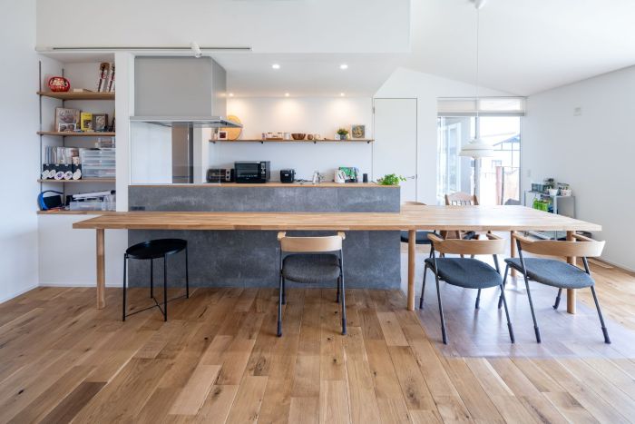 カウンターと一体となったダイニングテーブルが目を引くキッチン
