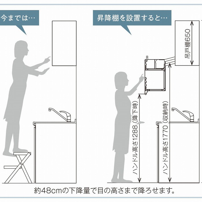 ダウンキャビネット ダウンキャビネット 商品コード:SPM07343 ¥23,650~(税抜:¥21,500~) 出荷目安2営業日後(在庫がある場合) ダウンロード 30-3736(W900用)承認図PDF.pdf ダウンロード 30-3737(W750用)承認図PDF.pdf ダウンロード 30-3738(W600用)承認図PDF.pdf ダウンロード 取扱説明書PDF.pdf ダウンロード 工事説明書PDF.pdf ご注意事項 ・箱と扉は現場でご用意下さい。(収納ラック・固定金具のみの商品です) ・収納できる重さは15㎏までとなります。 ・ビン、包丁、薬品など危険な物、割れやすい食器、ぬれた物は収納しないでください。 ・収納物が収納ラック上面より上に出ないようにしてください。 スペースを無駄なく生かすアイレベルまで下げて出し入れ可能な昇降式吊戸棚 取付も簡単!踏台無しでよく使う物をすぐ取り出しできる収納 従来品よりも出し入れラクラク!さらに5㎝下へ下がる新設計 余裕の大収納力、15㎏まで収納できます! 切替レバーでスムーズな昇降!軽い力で上下できます。 商品スペック サイズ W900用、W750用、W600用 材料 仕上 収納ラック(側板):ABS樹脂 収納ラック(背板・棚板):カラー鋼板 昇降ユニット:鋼板、鋼管(亜鉛めっき) 落下防止バー:鉄線(ポリエチレン被膜) カラー ホワイト キャビネット 内寸法 幅(W):858~872mm(W900用) 708~722mm(W750用) 568~572mm(W600用)奥行(D):310mm以上 高さ(H):560mm以上 定格荷重 15kg(W900用、W750用、W600用) 付属品 トラスタッピンねじ4×14㎜ ダウンキャビネット 画像 商品コード 商品名 数量 単価 30-3738 品番:30-3738 ダウンキャビネット W600用 数量 (台): 0 ¥ 25,289 (税抜¥ 22,990) 30-3737 品番:30-3737 ダウンキャビネット W750用 数量 (台): 0 ¥ 25,740 (税抜¥ 23,400) 30-3736 品番:30-3736 ダウンキャビネット W900用 数量 (台): 0 ¥ 26,169 (税抜¥ 23,790) カートに入れる おすすめ商品一覧 トールユニットシステム W300 商品詳細へ トールユニットシステム W400 商品詳細へ スライドストッカー/アルミタイプ(W150用) 商品詳細へ スライドストッカー/アルミタイプ(W200用) 商品詳細へ スライドストッカー/クロームタイプ(2段、3段) 商品詳細へ スライドストッカー/クロームタイプ(フキン掛け付) 商品詳細へ スライドストッカー/クロームタイプ(トレーホルダー付) 商品詳細へ スライドストッカー/シルバータイプ 商品詳細へ スライドストッカー/床付タイプ 商品詳細へ スライドストッカー/側付タイプ(在庫限り) 商品詳細へ