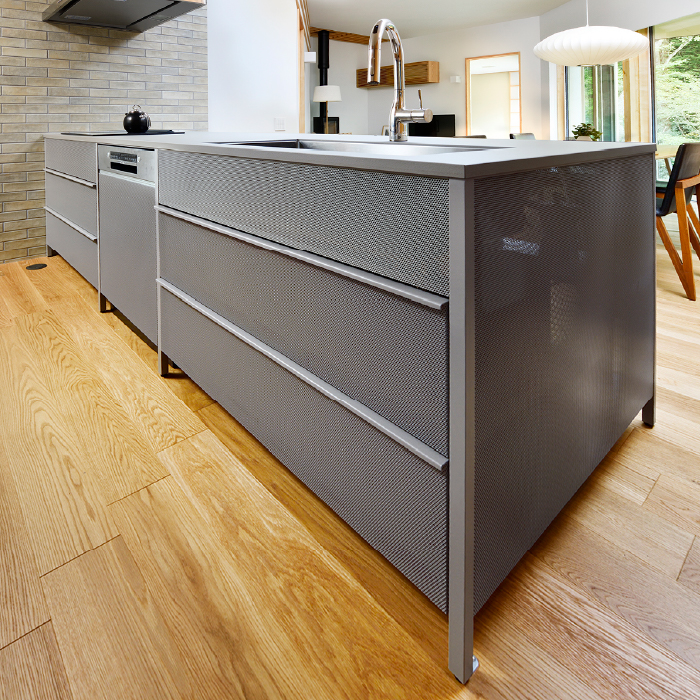細かい穴があけられたパンチングパネルは、キッチンの機能部や収納物をわずかに透けさせることでシルエットを際立たせ、空間のアクセントになります。