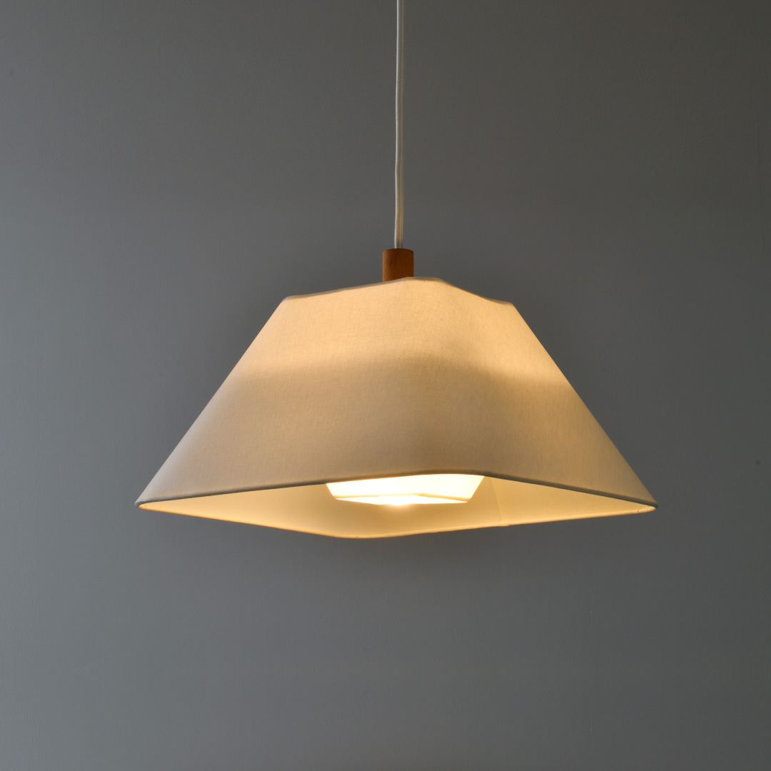 四隅にRを施した台形のフォルムが印象的なペンダントライト。両面にラミネート加工を施した綿生地の質感と相まって、そこにはどこか愛らしさすら漂う。